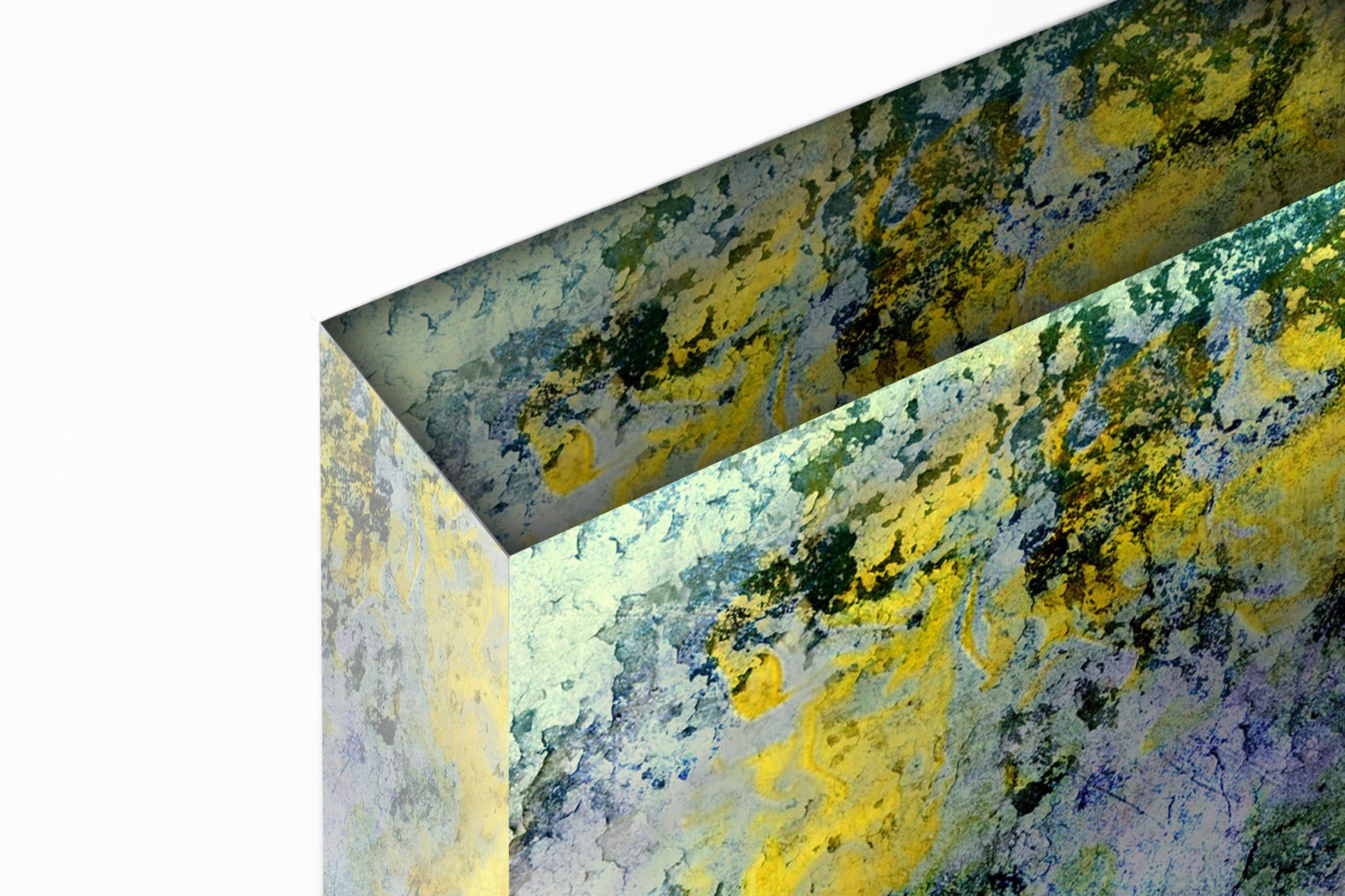 This artwork and collection are inspired by the infinite variety of nature’s impressive and breathtaking sceneries that surround us. When you are watching the sky, climbing on a mountain, walking in a forest or diving into the ocean. Every single artwork is a multilayer digital collage. Overpainted images of rough peeled surfaces, mixed with scratches and etchings. Details of aged textures and torn papers are scanned for the final processing.