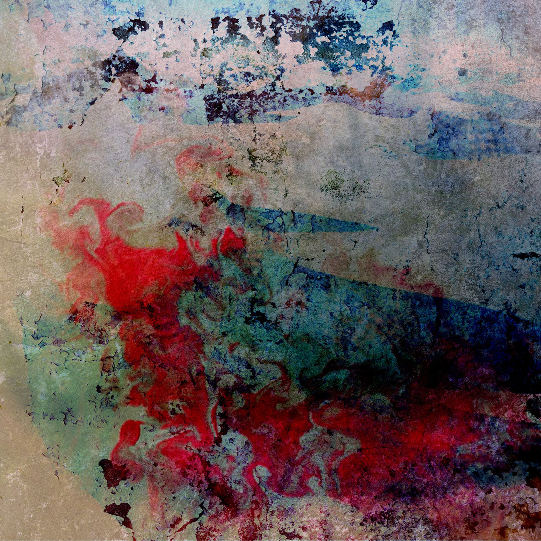 The creation process involves a collage of real images, rough peeled surfaces, coloured flakes, scratches, etchings and details of aged textures and torn papers. Collected materials are hand-coloured, scanned and digitally manipulated.
