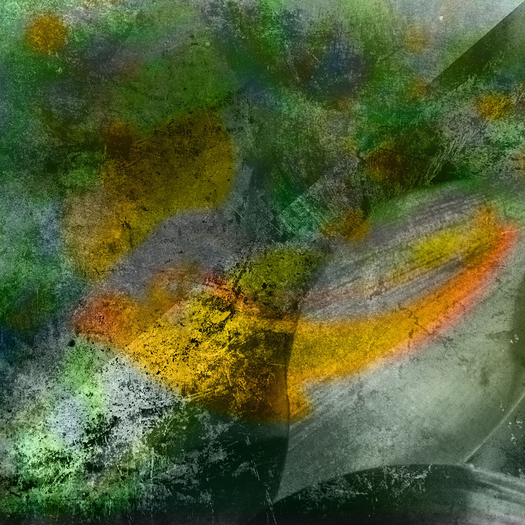 The creation process involves a collage of real images, rough peeled surfaces, coloured flakes, scratches, etchings and details of aged textures and torn papers. Collected materials are hand-coloured, scanned and digitally manipulated.