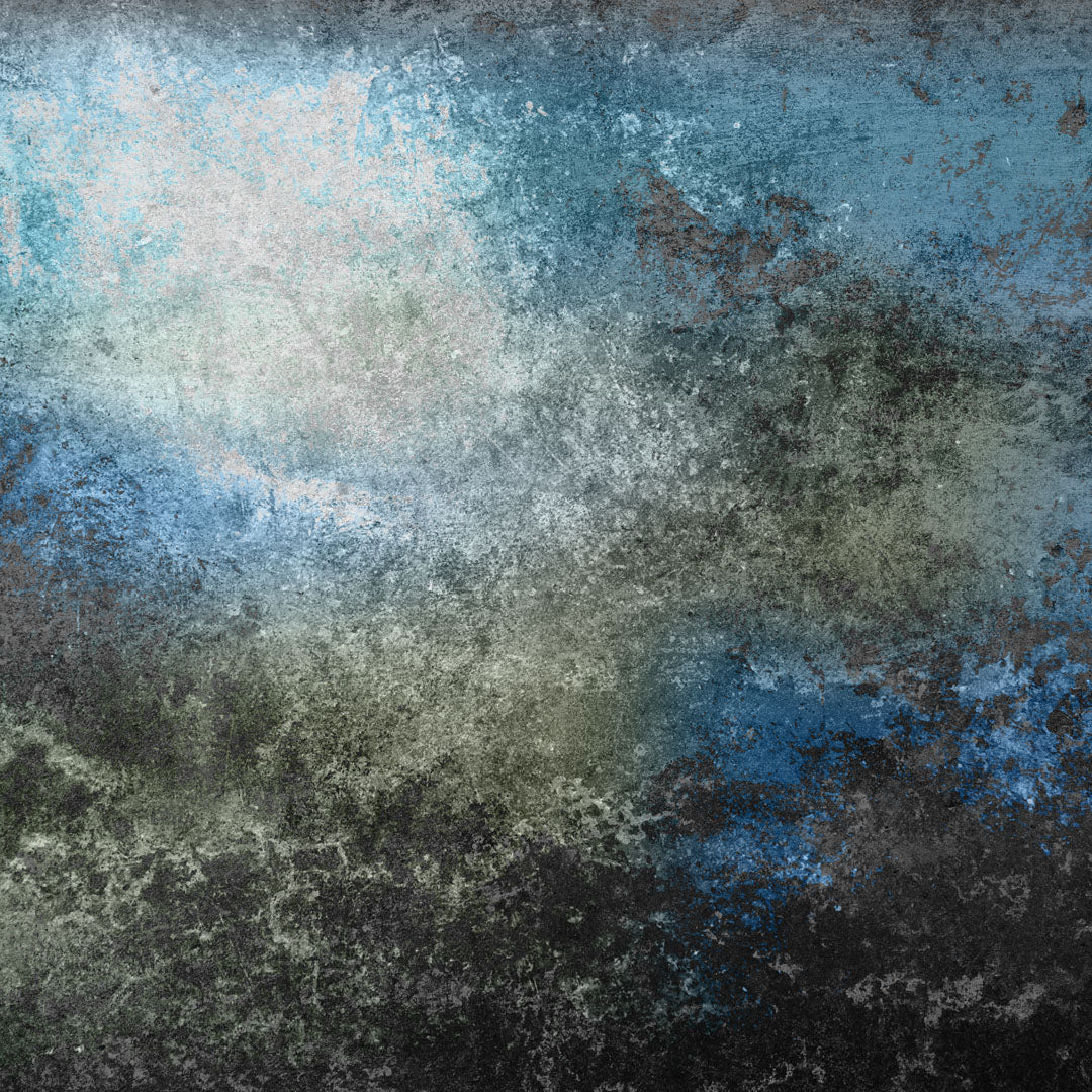 The creation process involves a collage of real images, rough peeled surfaces, coloured flakes, scratches, etchings and details of aged textures and torn papers. Collected materials are hand-coloured, scanned and digitally manipulated.