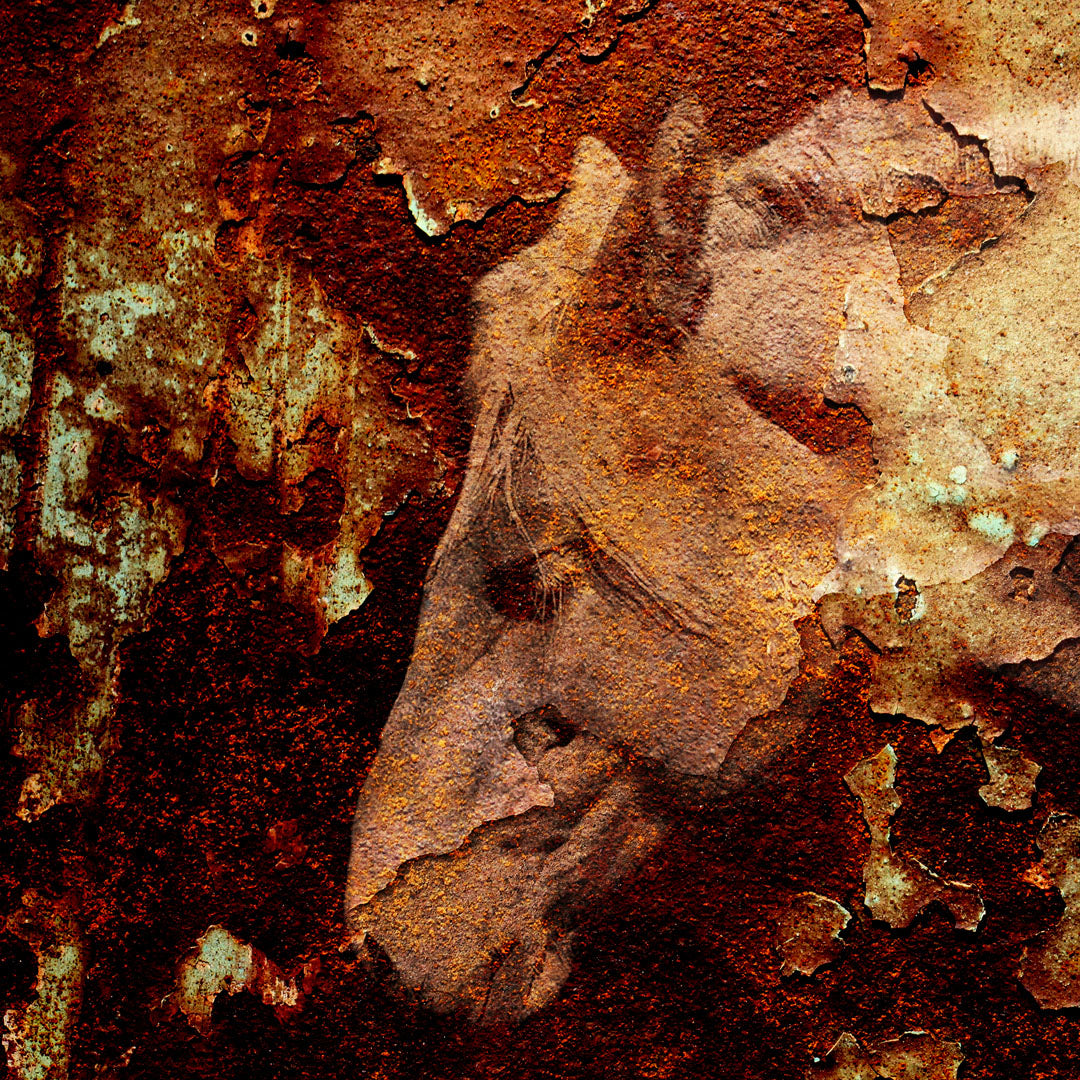 The creation process involves a collage of real images, rough peeled surfaces, coloured flakes, scratches, etchings and details of aged textures and torn papers. Collected materials are hand-coloured, scanned and digitally manipulated.